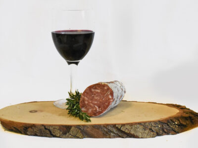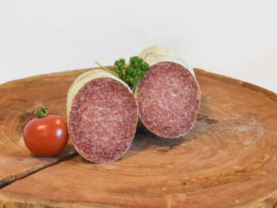 Gewicht ca. 100 g – Unsere hausgemachte Salami Casareccia wird aus Schweinefleisch hergestellt, luftgetrocknet. Mittelwürzig im Geschmack.